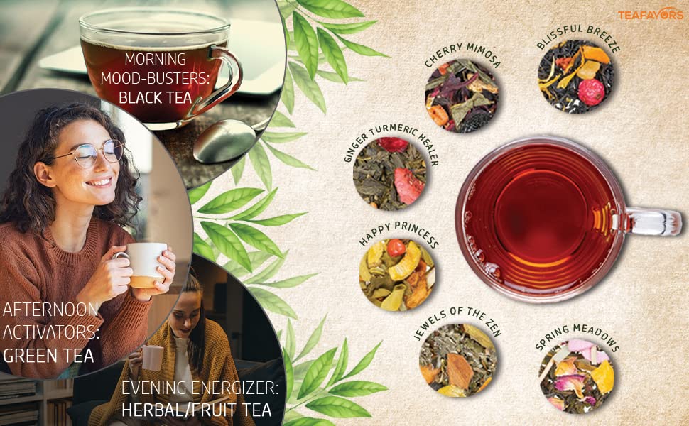 - TeaFavor’s assorted gift box contains 6 pouches with 20 grams of black tea, green tea, herbal or spice tea, and fruit tea. You get to try tea flavors from all over the world and experience the various cultures while sipping on your tea.